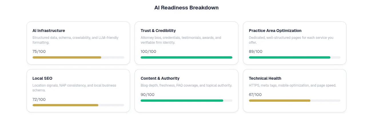 But what makes the diagnostic tool different from others is that it's customized to the legal industry; it looks for law firm-specific AI visibility factors. Trust signals in the form of credentials and memberships, analysis of content and technical SEO on attorney bios and practice area pages, and Legal Industry Schema are a few examples.